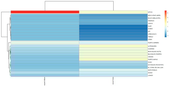 Subsequently, the analysis was carried out by using the “Divisive Analysis Clustering” DIANA technique to obtain a dendrogram that represents in a different way what was expressed in the previous methods (Figure 5) where the correlation of the data is 0.8515, being for [] 1 the most optimal and from 0.7 upwards acceptable. It is also notable that in this method, it is not necessary to specify the number of clusters beforehand. Additionally, the heatmaps technique is also used for better visualization (Figure 6).