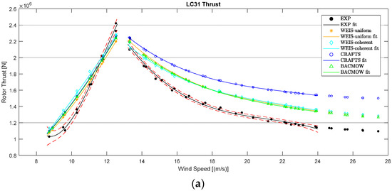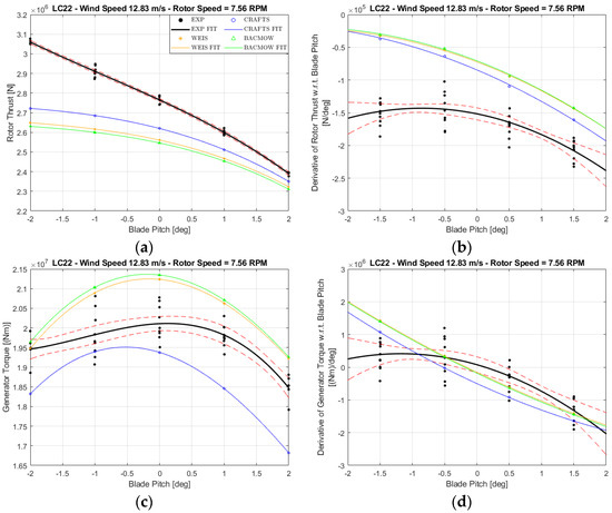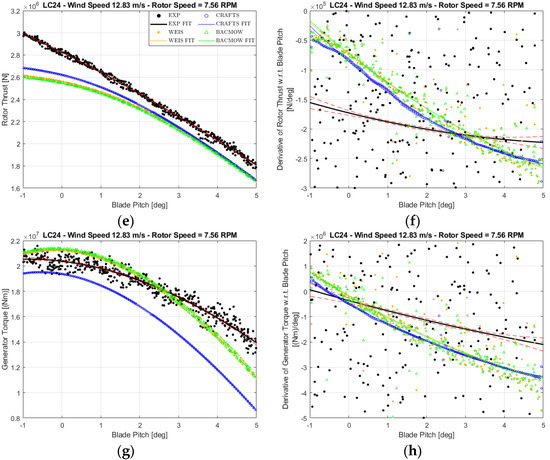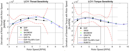 The results for LC 1.2, which was similar to LC 1.1, but with a pitch of 10°, were discussed here, but no summary plots were shown. The overall trends and magnitudes between the numerical and experimental results for the thrust, torque, and tower top forces and moments matched well. Similarly, the numerical results for the flap-wise and edge-wise blade root bending moments were quite close; most of the differences ranged between ~0–20% and ~0–40%, respectively. The primary difference in the post-processing of the LC 1.2 results was that a second-order polynomial was used to fit the limited experimental data (note that experimental results were limited to rpm = 3–6) and, subsequently, differentiated to yield the derivatives of thrust and torque with respect to the rotor speed. The numerical polynomial coefficients for the two sensitivities were computed in the same manner as described above. To enable and improve control co-design, the coefficients can be provided on request.