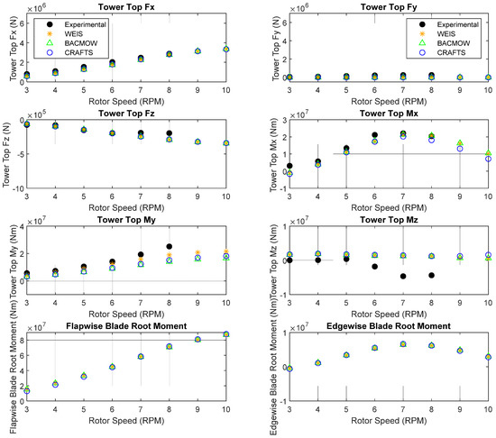 For these load cases, steady-state results at eight prescribed/fixed rotor speed values (3–10 rpm) were shown. The turbine static offsets were removed from the tower top forces and moments. For these load cases, the controller was not active, and the rotor speed and pitch were fixed.