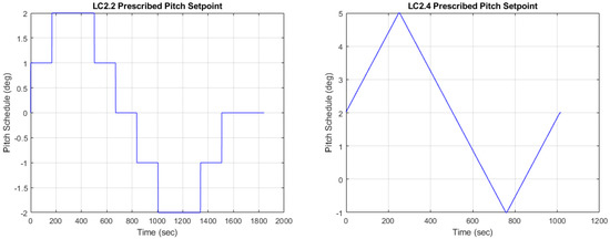 In LC 2.X, the rotor speed was fixed at the rated speed (7.56 rpm) and the pitch was varied with both stepped and ramped profiles. Continuing to focus on those load cases around the transition region, Figure 6 illustrates the prescribed pitch schedules for LC 2.2 and LC 2.4. The ramped cases were executed in the wave basin as tiny steps that approximated a ramp. Though setting pitch setpoints in the wave tank was fairly straightforward, the numerical tools could have difficulties with the discontinuities (step changes), such as the step change in the pitch at t = 0. As a result, pre-simulation time was added to the simulations during run-time and, subsequently, removed during post-processing to remove initial transients or artifacts from the numerical results. Carrying this out allowed the simulations to behave well during the initial pitch step. In addition, the WEIS team smoothed the pitch steps throughout the time history to enable OpenFAST to better handle the discontinuities (using the OpenFAST SimuLink interface).