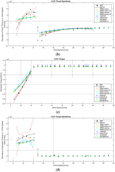 LC 3.1 thrust, torque, and their sensitivities with respect to wind speed: (a) thrust; (b) thrust sensitivity; (c) torque; (d) torque sensitivity. The red dashed lines show the uncertainty in the experimental data only.