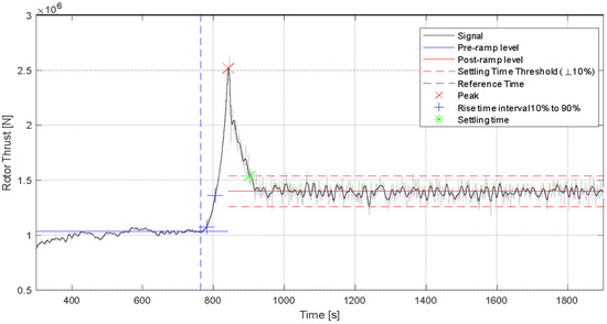 In this load case, a steady wind (held for ~500 s) at a below-rated condition (~8 m/s) was suddenly increased to well above rated conditions (~23 m/s) and sustained at that wind speed for over 1000 s (before suddenly reducing again). The primary objective was to understand how the controller reacted to the sudden gust, specifically in terms of damped response characteristics (e.g., rise time, settling time, and overshoot/peak). Figure 11 shows how these metrics were calculated.