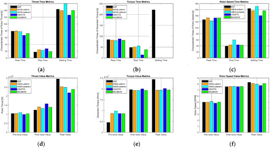 The rise time was defined as the time to cover, from 10% to 90%, the difference between the pre-ramp and post-ramp levels. The peak time is self-explanatory. The settling time was based on a threshold as a percentage of the post ramp value. For rotor thrust, the threshold was +/−10% of the post-ramp thrust. For torque, it was +/−5% and +/−2% for rpm. A different percentage threshold was used for each channel because of the different noise-to-signal ratios and peak values. For example, the threshold needed to be lower than the peak but higher than the noise. Figure 12 shows the real-time pitch, rotor speed, thrust, and torque. Figure 13 shows the values for the metrics for the thrust, torque, and rotor speed. In Figure 13, there was no settling time for the numerical results for torque, because the overshoot in torque from the simulations was negligible.