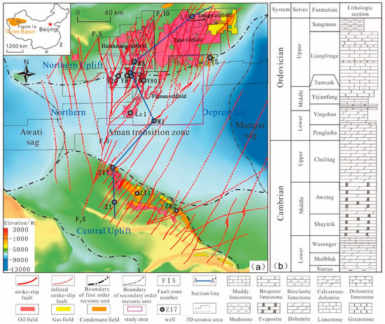 (a) The strike-slip fault system in the Ordovician carbonates (the figure at the top left corner shows the location of Figure 1a in the Tarim Basin) and (b) the Cambrian-Ordovician stratigraphic column in the Tarim Basin (The strike-slip fault zones are mapped by 3D seismic data, and the color base map shows the topography of the top of the Ordovician carbonate; the oil/gas distribution and tectonic sketch appear as in Reference [26]).