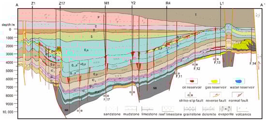 A circum-Aman strike-slip fault system with an area of 90,000 km2 has been found in the central Tarim intracratonic basin (Figure 1) [15]. It comprises the northern uplift, northern depression, and central uplift. The Phanerozoic strata are relatively complete, including a more than 3000 m thickness of Cambrian-Ordovician carbonates in the central Tarim Basin (Figure 1b). There are multi-stage tectonic events, along with multiple unconformities from the Silurian to the Cretaceous eras, along with a Cenozoic quick and deep subsidence in the petroleum system [13,14]. Two sets of source rocks have been documented from the Lower-Middle Cambrian and the Middle-Upper Ordovician periods [13], although there is still hot controversy on the contribution of each source rock. Along with studies of hydrocarbon accumulation history, there are three major stages of oil/gas accumulation: the oil accumulation in the late Caledonian period (Ordovician-Silurian), the accumulation in the late Hercynian period (Permian), and the gas charge in the late Himalayan period (Neogene) [27]. Following multiple tectonic-sedimentary cycles and multistage oil/gas emplacement, more than ten production layers from the Cambrian-Ordovician carbonates and Silurian-Cretaceous siliciclastic rocks have been found in the intracratonic basin [13]. The Ordovician carbonate reservoirs in the central uplift and northern uplift are favorable for oil/gas accumulation and preservation [13,14].