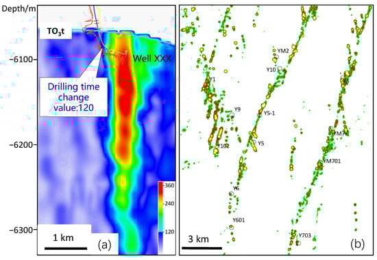 (a) Tensor thickness attribute sections and related well drilling times showing the boundaries of the fault damage zones and the fracture-cave reservoir (the boundary in the tensor thickness amplitude value is consistent with the drilling time curve); (b) plane amplitude change rate showing fracture-cave reservoirs overlapped with strike-slip faults in the Fuman Oilfield (bright yellow patches are fracture-cave reservoirs).