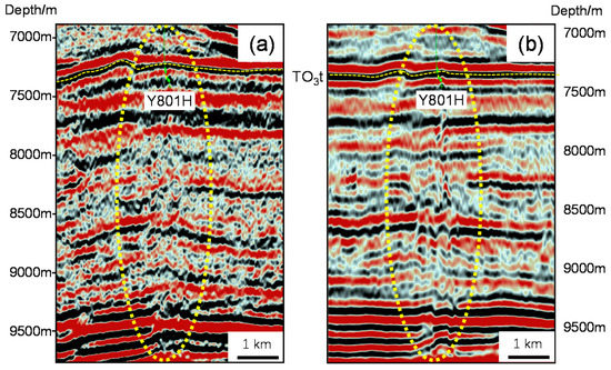 (a) Original seismic section and (b) the effect of two-facies (seismic facies and sedimentary facies) constrained reservoir inversion for a strike-slip fault zone (the yellow-red block showing fracture-cave reservoirs; TO3t: base of the Upper Ordovician).