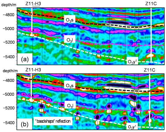 It is noted that more than 200 wells indicated that the major oil/gas production is from fracture-cave reservoirs in the tight matrix carbonate basins (Figure 4a), although the origin of the dissolution porosity is still ambiguous. Large fracture-caves are also characterized by significantly enlarged borehole diameter, increased natural gamma, and reduced resistivity in the logging data [13]. In the logging interpretation data, the porosity and permeability vary in a large range from 4% to 46% and from 1–1000 mD, respectively. Most of the high production wells have a “bead-shape” reflection (low frequency and strong amplitude reflection of wave crest and trough in the seismic data) in their seismic profiles (Figure 4a). Recent production data revealed that greatest number of high production wells occurred along the fault zones from the scattered “sweet spots” of fracture-caves. Although cores were difficult to obtain from the large caves, the high mud loss, abnormal drilling breaks, and mud overflow indicated that many wells encountered large caves during drilling.