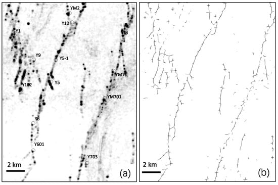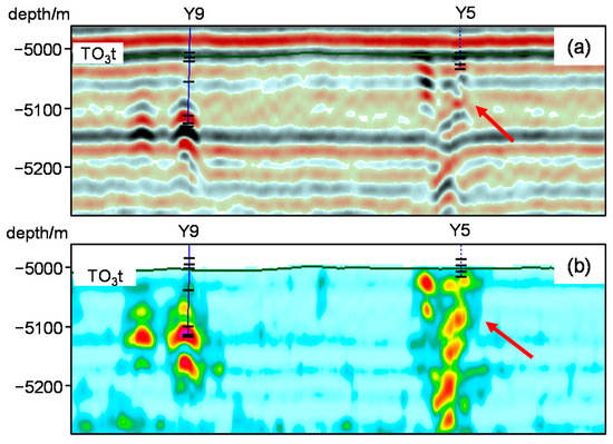 In recent years, a series of seismic studies have been carried out to describe the fractured reservoirs in ultra-deep strike-slip fault zones [15]. Due to intense dissolution along the fault damage zone, the large fracture-cave reservoirs can be imaged by the amplitude change rate (Figure 4b and Figure 7b) and structure tensor attribute (Figure 4a) [26].