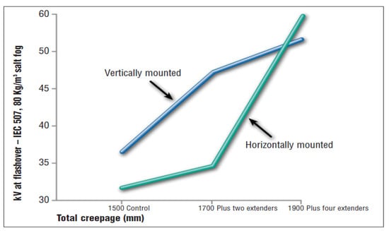 The flashover voltage will be adjusted by changing the creepage distance of the insulator, thereby reducing the leakage current and improving the strike distance as well as the insulator shape. Depending on the insulator type, the creepage extender is manufactured with semirigid polymer or flexible polymeric skirts. The creepage extenders are expensive and only used when other techniques are not possible. Figure 1 indicates the results of the flashover test performed on 66 kV post insulators with different creepage distances and a constant contamination level determined by the IEC507 standard. It is indicated that the flashover voltages increase when the creepage distances increase [9,41].