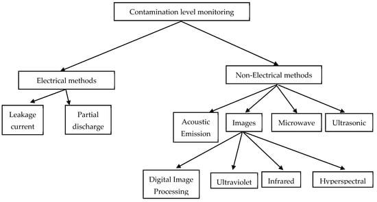 One of the critical aspects for reliable operations of high-voltage equipment is contamination monitoring and prediction and cleaning of the high-voltage insulators. Specifically, the prediction and monitoring capability allows the electric utilities to have an optimized schedule for washing live lines and substation insulators. This translates into significant cost savings while improving the electrical system’s reliability by preventing disastrous flashover events. In what follows, various indicators used for insulator contamination assessment and the related signal-processing techniques are discussed using a comprehensive account of the relevant literature. Figure 2 shows the different contamination level monitoring methods.