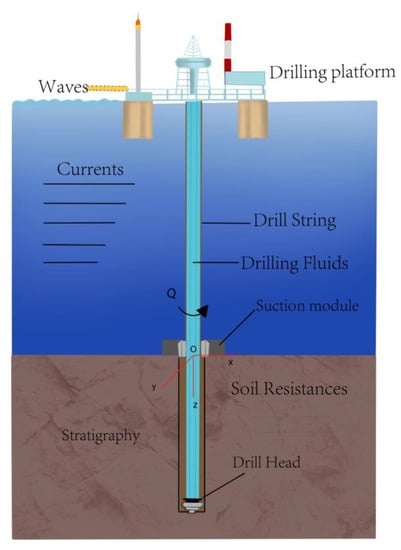The RMR drilling system adopts the Riserless technology to eliminate the use of conventional drilling risers. With the drill column directly into the seawater and the subsea suction module mounted on the wellhead, it can isolate the seawater from the returning drilling mud and seal the borehole from the seawater. In the RMR drilling system, the drilling fluid is pumped into the drill pipe by the surface pump and reaches the bottom of the well through the drill pipe, which will shock and break the rock, and carry the rock chips back up from the borehole annulus, where it will be diverted into the subsea lift pump set by the subsea suction device at the top of the annulus. The rock chips and the drilling fluid will flow back to the drilling platform through the mud return pipeline under the action of the subsea pump. The suction module and the conductor can be considered to be rigidly connected. Therefore, the conductor is mainly subjected to the soil resistance forces and the current forces transmitted by the suction module when performing subsea operations.