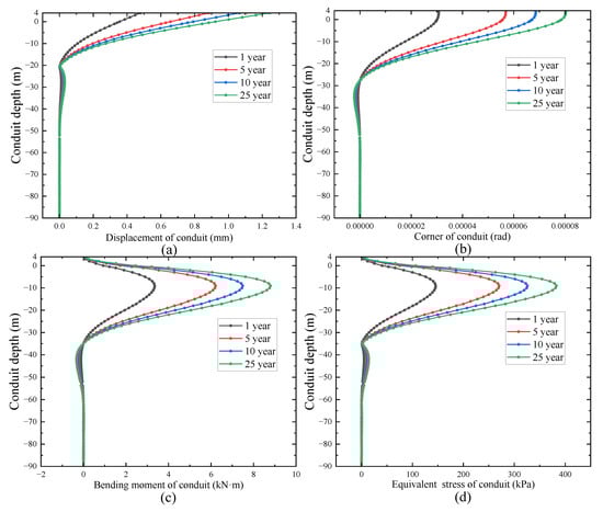 (a) Effect of seabed soil properties on conductor displacement, (b) Effect of seabed soil properties on conductor turning angle, (c) Effect of seabed soil properties on conductor bending moment, (d) Effect of seabed soil properties on conductor equivalent force.