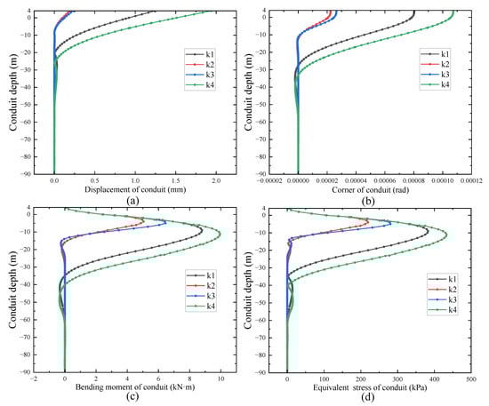 When the upper of the conductor receives a load, the conductor in the soil will receive the soil resistance, the bearing capacity of different soils differs from each other, so it will have an effect on the conductor stability. The higher the stiffness factor of the soil, the harder the soil, and the results are shown in Figure 5. The results show that all stability parameters of the part of the conductor within 30 m depth decrease with the increase in the stiffness coefficient of the soil. The displacement and turning angle of the part of the conductor above 30 m depth do not change with the soil, which can be deemed that the soil imposes fixed constraints on the lower conductor. Due to the different soil depth distributions, it can be seen that different soil conditions have different turning points for each of their stability parameters affecting the conductor, but the turning influence trends are roughly the same.
