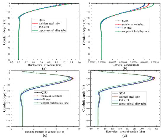 The results of the effect of common conductor materials on conductor stability are shown in Figure 6. The results show that the displacement and turning angle of the conductor increase with the decrease in the elastic modulus of the conductor material; the opposite is true for the bending moment and equivalent stress of the conductor. The effect of conductor material on the displacement and turning angle is mainly concentrated within 20 m depth. The effect on bending moment and equivalent stress is mainly concentrated within 30 m depth. Since the elastic modulus of the conductor material is very close to the rigid body, the current common conductor material has few effects on the various stability parameters of the conductor, and other factors such as corrosion resistance should be considered in selecting the conductor materials.