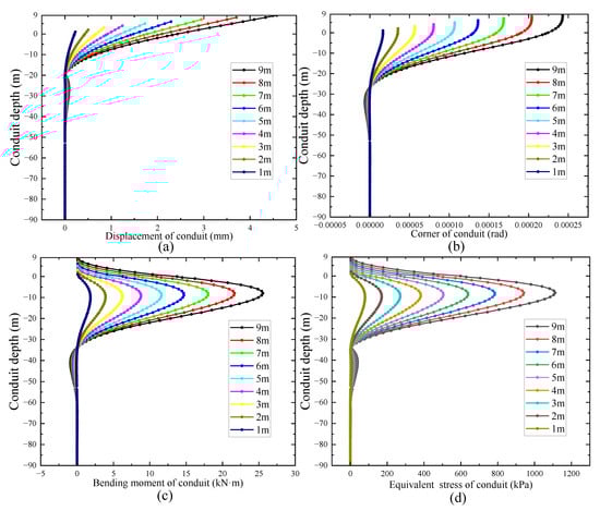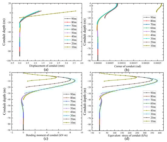 Set the driving depth of conductor in the mud as 90, 80, 70, 60, 50, 40, 30, 20, and 10 m, and the results of its effect on the conductor stability are shown in Figure 7. The results show that the displacement and turning angle of the conductor increase with the decrease in the driving depth, and the increase in the displacement and turning angle of the conductor is small when the driving depth is 30–90 m. When the driving depth decreases to 20 m, the displacement and turning angle of the conductor start to increase significantly; when it decreases to 10 m, the displacement and turning angle of the conductor happen to increase sharply. It can be inferred that the minimum driving depth of the conductor in the mud is about 20 m in this soil condition. For both conductor bending moment and equivalent stress, the turning point is about 5 to 10 m. Within the driving depth of 30 m, both conductor bending moment and equivalent stress change obviously, and when the driving depth exceeds 30 m, both conductor bending moment and equivalent stress gradually decreases to 0. Therefore, the effect of the conductor depth in the mud on the stability of the conductor is more obvious, when the driving depth is too small, it will lead to excessive conductor deflection in the limited working conditions and it should be designed according to the reasonable soil entry depth.