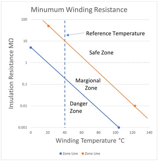 For large motors and generators, the recommended minimum insulation resistance (), for armature and field windings can be seen in Figure 4, and can be calculated using Equation (2) [28]: