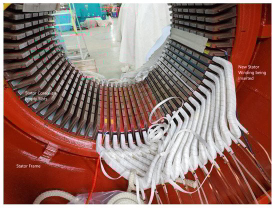 Small motor windings are predominantly wound with enamel insulated copper wire. There are various types of enamel used for this insulation and normally consist of polyamide-imide resin and polyester-imide resin alternately layered. Testing this insulation to gauge life under various situations is an ongoing process with OEM’s (Original Equipment Manufacturer) having their own enamel formulas and layering requirements [30]. In high voltage motors (>3 kV) there are various materials and resins employed to make up the electrical insulation. There are three key areas that require different properties of insulation and flexibility. They consist of main ground wall insulation, end winding insulation, and turn to turn insulation. In these larger machines there can be various materials and resins employed to make up the electrical insulation layer or ground wall insulation as well as the turn-to-turn insulation [31,32], but the application of different materials, different layer thicknesses, order of insulation [30] and various epoxy resins is always a compromise between electrical insulation properties, thermal conductivity and mechanical strength. Thermal cycling damages this insulation and damaged insulation is very susceptible to moisture absorption.