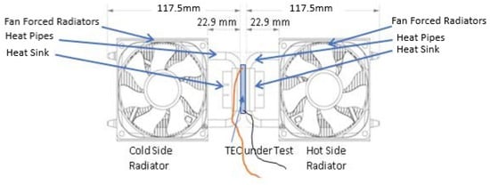 To test the performance of the TEC in a realistic, open environment (rather than in a lab with the cold side of the TEC held at 0 °C), a TEC test frame was constructed from two heat exchange units made up of fan cooled radiators attached to a heat sink via heat pipes. One heat exchanger was attached to the TEC hot plate and the other heat exchanger was attached to the TEC cold plate as shown in Figure 7. Six commonly available TECs with different current ratings, were tested, the type of each TEC is displayed in Figure 8, and all TECs had the same area (40 mm × 40 mm). Each TEC was supplied with current, in steps, up to name plate rating and the resulting plate temperatures of the hot side and the cold side surfaces recorded. The experimental temperature measurement results can be seen in Figure 8 and the watts transferred in Figure 9. This open environment testing reflects the TEC performance as a heat pump in normal environmental conditions and temperatures. Data about this scenario does not exist in any data sheets and was required to gauge the capability of the various TECs to help in selecting units most suited to the task.