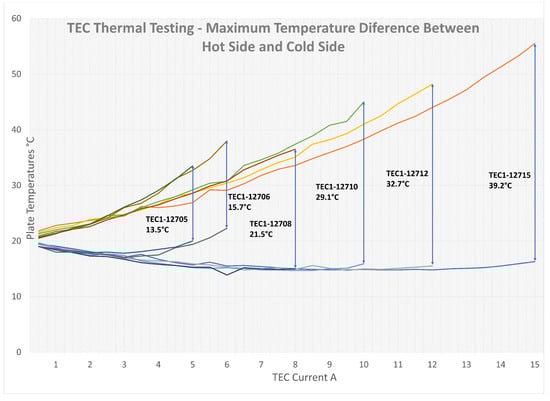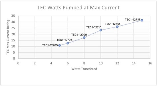 The measured and plotted performance in Figure 9 are less than data sheet values, but this can be explained, considering the data sheet values are measured in ideal conditions with the cold plate at 0 °C. The performances measured with this test arrangement are at indoor temperatures, as expected in operational conditions. As shown in Figure 9, TEC performance is approximately linearly proportional to the size or maximum current rating of the TEC.