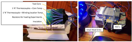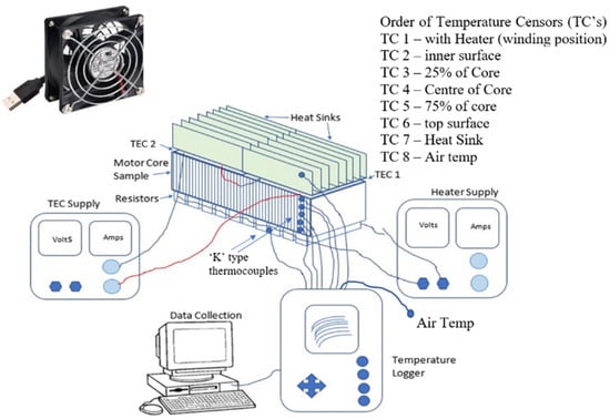To test the ability of the TEC to affect the inner core temperature of a motor, a core section was set up to represent the thermal characteristics of a motor that we could attach TEC’s and monitor thermal results. With the core section with resistive heaters attached on the inner surface representing the winding, then the test piece was well insulated with just the upper surface exposed, simulating the thermal environment for a motor. With the internal resistors unpowered, the test piece represented an unpowered motor. A section of a stator core was cut to match the 40 mm × 40 mm thermoelectric devices. The core segment was cut 40 mm wide, 80 mm long and 35 mm deep containing 150 laminations, approximately 0.473 mm thick (Figure 10). Five 2 mm holes were drilled into the sample segment to enable K type thermocouples to be inserted so that temperatures at both surfaces and 3 positions across the core sample could be measured. Eight 22 , 10 W resistors were glued to the inner surface and connected in parallel (80 W capability) and for this analysis, it represents a motor winding and winding insulation. The core segment was then insulated with only the top surface exposed, representing the outer motor surface. Two TECs with heat sinks were then attached to the upper surface, utilising thermal grease for improved thermal conduction. The general setup can also be seen in Figure 11.