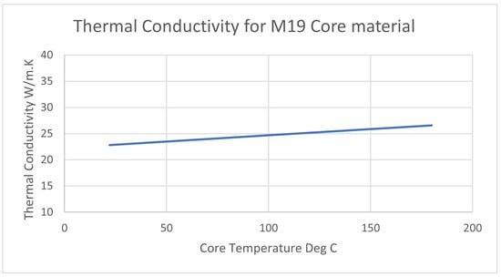 The most utilised material for motor cores is M19 and work by Pieterse [37] shows that thermal conductivity of motor core material M19 (2.75% silicon steal) varies between 22.8 W/m × K at 22 °C, 24.7 W/m × K at 100 °C and 26.6 W/m × K at 180 °C as shown in Figure 12. The figure shows that thermal conductivity slightly increased with temperature.