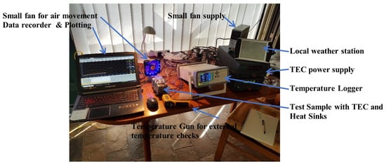 In the test setup in Figure 11, the TECs were attached to a 15 V/30 A laboratory power supply. The thermocouples were attached to a temperature data logger connected to a laptop to capture and plot each of the thermocouple temperatures. Additionally, there was a local weather station allowing temperature, humidity, and pressure in the test area to be recorded during testing. A small 12 V computer fan with supply was set up to provide a fixed low velocity airflow across the sample. The layout of the equipment can be seen in Figure 13.