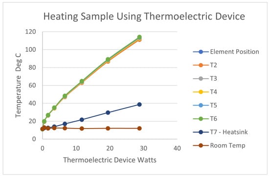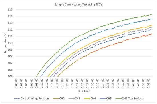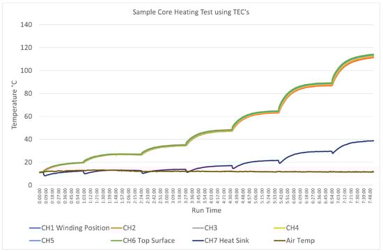 The test core sample was positioned clear of other items and in front of a small computer fan, allowing unobstructed movement of a low speed air current, as shown in Figure 11. Seven power settings (0.5 A–0.5 W, 0.9 A–1.62 W, 1.3 A–3.51 W, 1.7 A–6.63 W, 2.2 A–11.66 W, 2.7 A–19.44 W and 3.2 A–28.8 W) were supplied to the TEC modules to pump heat into the core sample. Temperature change of the core sample location per unit of power into the TEC is reported here as . Temperatures of each thermocouple were recorded and plotted, shown in Figure 14, and magnified end temperatures Figure 15, using a data logger and the temperatures allowed to stabilize (specifically TEC1 and TEC2 the winding position test points-approximately 1 h at each setting) before final temperatures and environmental conditions were recorded.