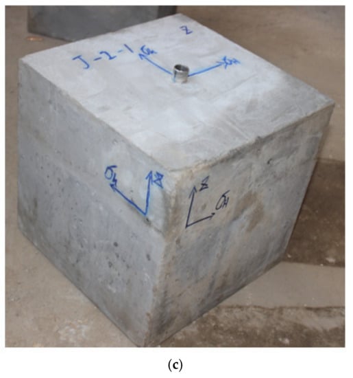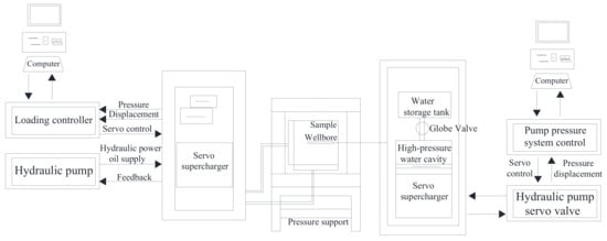 The directional fracturing experiments were performed by a true triaxial hydraulic fracturing test system (Figure 2). The system contains a large-scale true triaxial testing machine and a hydraulic fracturing pumping system. The large-scale true triaxial testing machine is servo-controlled and can provide compressive stresses with a maximum load of 8000 kN in three mutually perpendicular directions independently. Its function is to simulate the in situ stress state in deep formations. The hydraulic fracturing pumping system, which has a maximum fluid injection pressure of 140 MPa and a maximum permissible injection volume of 800 mL, is used to inject the fracturing fluid. It can achieve pressure and displacement control. The controlled flow rate range is 0.01–10 mL/min. The parameters related to the above two subsystems were controlled and real-time recorded by computer. The system is qualified for simulating the initiation and propagation of hydraulic fracture under different test conditions.