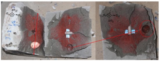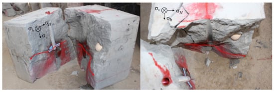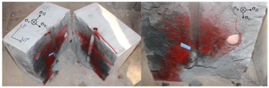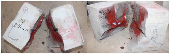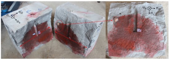 - Fracturing fluid was injected into the specimen at a given pumping rate, while the data acquisition system was activated synchronously to collect the data during the test. It should be noted that a type of red tracer had been mixed into the fracturing fluid to identify the propagation range of hydraulic fractures.