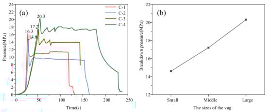 The pressure curves of samples C-1 to C-4 were plotted in Figure 10a. For the sample without vug (C-1), the shape of pressure curve o was conventional, corresponding to the simple morphology of the hydraulic fracture. The pressure curve of sample C-2 with a small vug was similar to that of sample C-1: growing rapidly to the breakdown pressure, dropping sharply, and finally maintaining relatively stable. For the specimens C-3 and C-4 with relatively middle- and large-sized vugs, remarkable pressure fluctuation was observed following the breakdown stage, reflecting the interaction between the hydraulic fracture and the vug during the extension. With the increase of vug size, the duration of pressure curve fluctuation became longer.