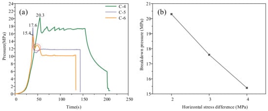 The breakdown pressure and its variation under different horizontal stress differences are drawn in Figure 11b. With the decrease of horizontal minimum stress, the difficulty of initiation of the hydraulic fracture decreased, leading to the gradual decrease of breakdown pressure. The average decrease in the amplitude of breakdown pressure was 14.82%.
