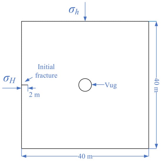 As shown in Figure 12, considering the influence of vug size, horizontal stress difference and internal pressure within the vug on hydraulic fracture propagation, a 2D model was established. The size of the model to simulate the reservoir rock was 40 m × 40 m. An initial fracture with a length of 2 m long was placed in the center of the left boundary of the model. Meanwhile, a vug was set in the center of the model. Table 2 lists the basic parameters of the simulated reservoir. It should be noted that the fluid viscosity (50 mPa·s) and pumping rate (5 m3/min) refer to the field fracturing construction. While in laboratory scale, these parameters should be adjusted. Because the poured cement sample is more porous than the real reservoir formation, so the fluid viscosity was increased from 50 mPa·s to 100 mPa·s to counterbalance the filtration loss. At the same time, in order to achieve the quasi-static propagation of the hydraulic fracture, the pumping rate was reduced from 5 m3/min to 5 mL/min.