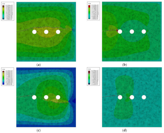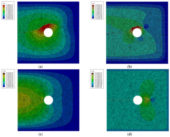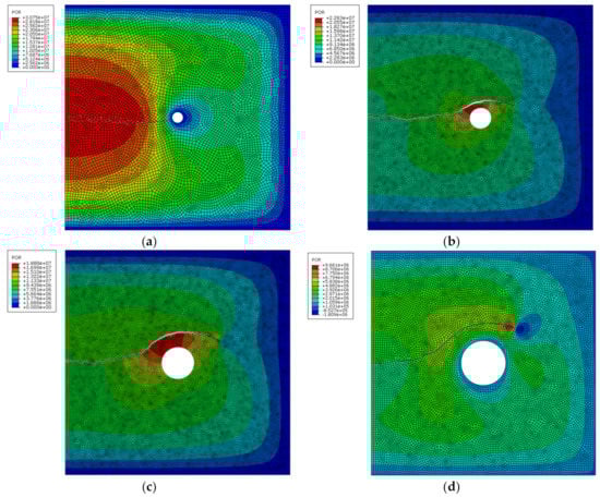 The effects of four types of internal hole pressures on crack extension were studied under the conditions of horizontal maximum principal stress of 75 MPa, horizontal minimum principal stress of 65 MPa, and hole radius of 3 m. The internal pressure difference was defined as the difference between the horizontal minimum principal stress and the internal pressure of the vug. As shown in Figure 15a,b, the hydraulic fractures bypassed the vug expansion when the internal pressure difference was 15 and 10 MPa. The fracture moved closer to the vug as the internal pressure difference decreased. When the internal pressure difference was 5 MPa, the expansion of the hydraulic fracture was stopped by the vug (Figure 15c). With an internal pressure difference of 0 MPa, as indicated in Figure 15d, the hydraulic fracture proceeded to extend directly through the hole. The smaller the internal pressure difference was, the easier the hydraulic fracture could overcome the stress concentration generated by the vug, and the easier it was to communicate with the vug.