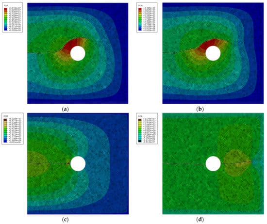 Cloud diagram of fracture propagation under different internal pressures of the vug: (a) P = 50 MPa; (b) P = 55 MPa; (c) P = 60 MPa; and (d) P = 65 MPa. (POR is the pore pressure. With the color gradually changing from red to blue, the pore pressure decreases.)
