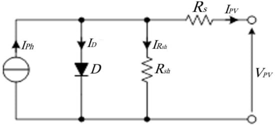 where Iph is the light-generated current, which depends on the irradiance, G, and the cell temperature Tc; Rs is the series resistance; Rsh the shunt resistance; q is the charge of the electron; k is the Boltzmann’s constant; T is the PN junction temperature; and ns is the number of series cells in the module.