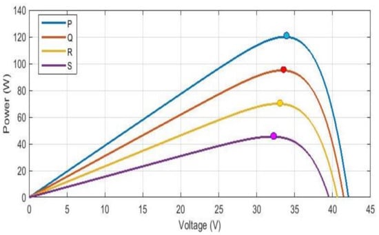 Under an ordinary condition, when the PV panel receives different values of uniform irradiance, the P-V curves show one MPP each, as presented in Figure 2.