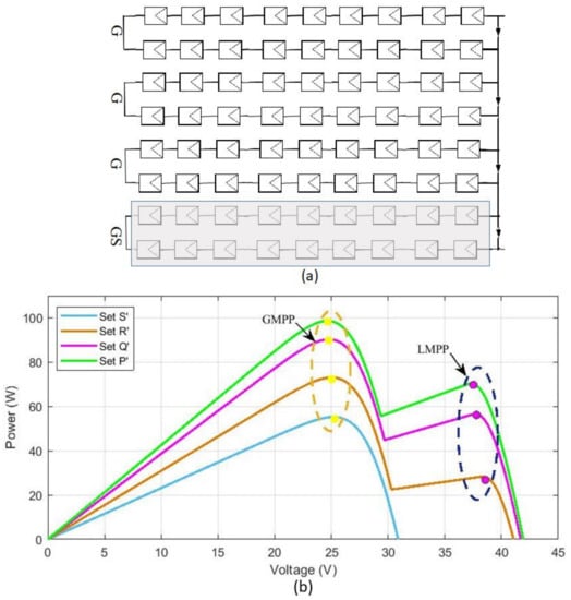 When partial shading happens, the shaded string of the panel will not create as much current as the unshaded strings. This downside is defeated by utilizing a bypass diode that permits the current of the unshaded cells to bypass the shaded cell. The changes in the irradiance of shading panel area (GS), which affects 25% of the panel area, and non-shading panel area (G) were established in four sets, as shown in Figure 3a,b and Table 3. Figure 3b shows that each P-V curve was characterized by two peaks designed by global MPP (GMPP) and local MPP (LMPP) [19,20,21].
