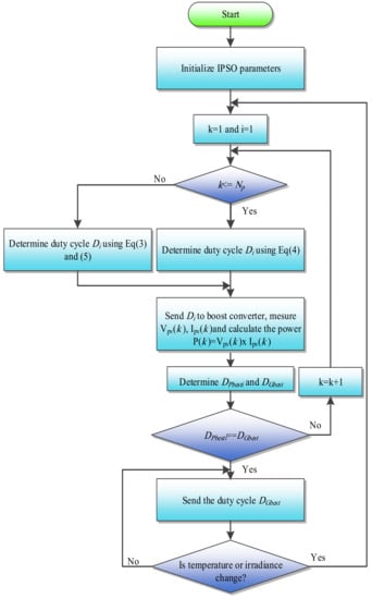 The Improved Particle Swarm Optimization (IPSO) method, introduced in [13], has the capacity to locate the MPP, where the positions of the PSO particles correspond to duty cycles. IPSO has high potential for MPPT due to the fast computation capability, regardless of partial shading.