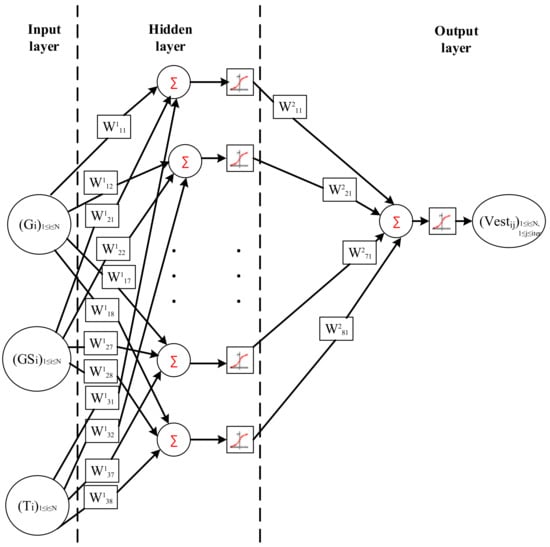 In order to keep the power level at the peak state and improve the energy efficiency, no matter how the environment changes, the NN-P&O technique based on the two controllers, the Neural Network (NN) and Perturb and Observe (P&O) methods, was simulated. The selected structure of the NN-P&O includes three simple layers: input, hidden, and output layers. The input layer has two nodes, the hidden layer has eight nodes, and the output layer has one node, as illustrated in Figure 5.