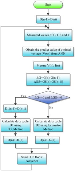 The main idea of the NN-P&O algorithm is using the NN controller to predict the voltage value during the variation in irradiation in the shaded and non-shaded areas, respectively; and are different to zero. Otherwise, the P&O method involves a very small step size to reach the MPP. This algorithm is presented in a flowchart (Figure 6).