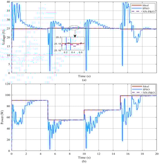 Simulation results under shading by the NN-P&O and IPSO algorithms: (a) voltage under shading, and (b) power under shading.