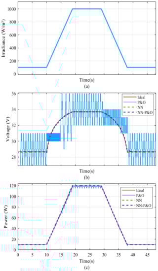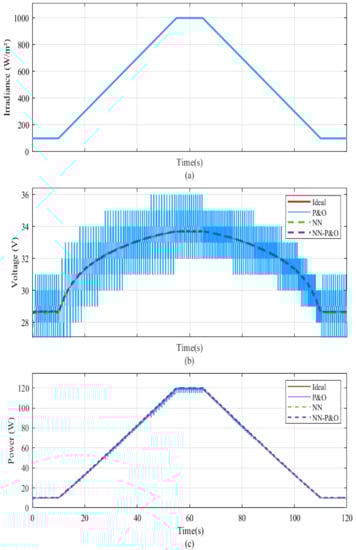 Different algorithms, i.e., P&O, NN, and NN-P&O, were incorporated in MATLAB/Simulink under ramp irradiation, as shown in Figure 8 and Figure 9.