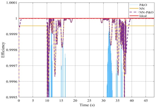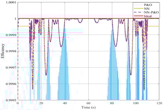 Figure 8b and Figure 9b show that the P&O method cannot track correctly the MPP exactly under fast ramp irradiance, where the PV voltage is largely oscillating around the MPP one. This has caused the harvested power to be less than the maximum available one. However, the MPP was tracked properly when the NN method was applied but with small error around the MPP voltage, causing smaller power loss, as shown in Figure 8c and Figure 9c. To enhance the precision at steady state, a combination of the two methods: P&O with a small duty cycle, which is used when the irradiation is constant, and an NN technique, which is integrated under fast ramp irradiation. The results of this hybrid method show that the obtained V-P are almost similar to MPP values. In order to determine the precision of P&O, NN, and NN-P&O techniques, the efficiencies (Essi)1≤i≤n were measured under the trapezoidal irradiation exhibited previously, showing the efficiencies presented in Figure 10 and Figure 11 below.