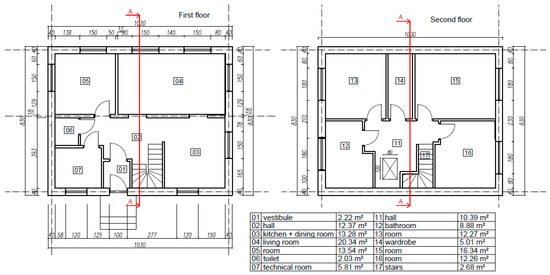 The analyses concern a single-family, two-story house made of lime and hemp technology, with 133.5 m2 of usable space. Figure 1 and Figure 2 show schematic plans and a cross-section of the building, respectively.