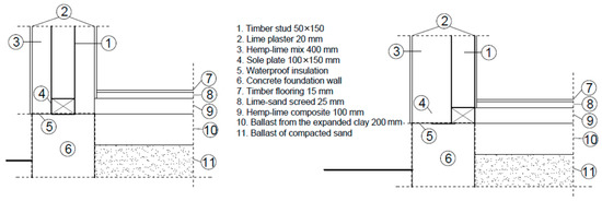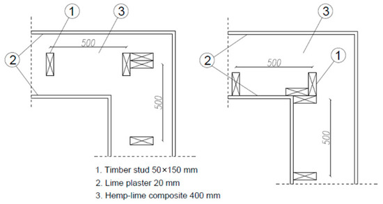 Building materials based on components of plant origin, such as hemp shives, which are used as a filler in an insulation material such as a hemp-lime composite, are particularly sensitive to the destruction caused by biological corrosion in long-term unfavorable humidity conditions [23,24]. The presence of a highly alkaline lime binder has a protective effect, but prolonged contact with water and temperature conditions favorable to mold may cause corrosive processes. Nevertheless, hemp-lime is a moisture-buffering material which stabilizes indoor humidity conditions in the rooms, which also reduces the risk of mold growth on the walls and improves the comfort of living [25]. In the technology of buildings insulated with a hemp-lime composite, the wooden structure is also exposed to the negative effects of thermal bridges. Wood is characterized by a low coefficient of thermal conductivity, about 0.16 W/(m∙K) [26] (although about twice as high as composite insulation), and unlike concrete elements, wooden elements are negligible thermal bridges. However, in some construction nodes, there is a need to use increased wooden cross-sections, and the heat transfer coefficient will consequently increase in these areas [27,28].