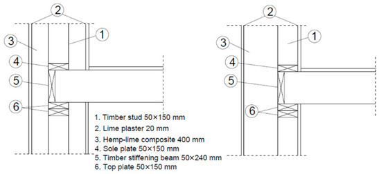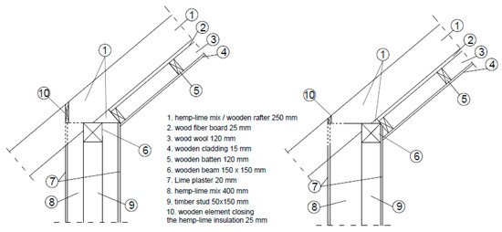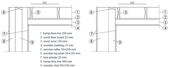 The calculations used the solutions analyzed in our previous works [27,28], and the remaining linear thermal bridges (connection of roof with knee and gable wall) were calculated especially for this study. External walls were assumed to have a timber frame positioned centrally in relation to the wall thickness and in the second case on the internal side of the wall. Both types of walls were insulated with a hemp-lime composite layer 400 mm thick, fulfilling the current requirements in Poland concerning the thermal transmittance coefficient (U ≤ 0.20 W/(m2·K). Diagrams of the analyzed junctions are shown in Figure 3, Figure 4, Figure 5, Figure 6, Figure 7 and Figure 8. These solutions are commonly used in practice, so only one type of each of the nodes was used.