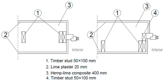 The linear thermal transmittance coefficients (ψ) of thermal bridges included in the model were calculated according to the ISO 10211 algorithms [36]. The analyses were based on the stationary, two-dimensional heat transfer and used the THERM program (V 7.6.1.0, Lawrence Berkeley National Laboratory, Berkeley [37]) to determine the temperature field in the nodes. Details on modeling assumptions can be found in publications [27,28]. Thermal properties of materials and elements used in modelling together with boundary conditions are compiled in Table 2 and Table 3. Lambda values of materials other than hemp-lime were acquired from ISO 10456 standard [26]. The estimated error energy norm (related to the gradient of heat flux) of the models did not exceed 5% in any of the cases.