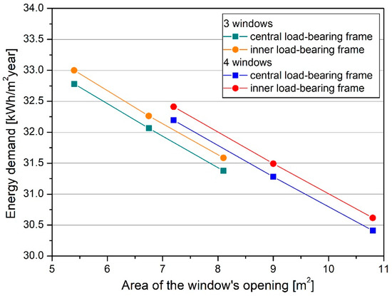 An increment of the window height resulted in a linear decrease of the energy demand (Figure 9), as the greater solar gains prevailed over greater heat losses through the area of the windows and edge thermal bridges. The differences between energy needs in the cases with the smallest and the biggest window area were approximately 5%. In all of the analyzed cases, heating demand was slightly lower (approximately 0.7%) if the load-bearing structure was located centrally on the wall. The changes in the length of the thermal bridges with positive thermal transmittance did not cause any major effect on the thermal properties of the building as a whole, confirming the results obtained in the base case (with the smallest size of the windows).