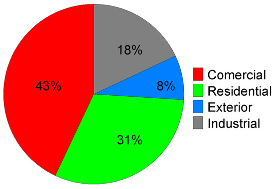 The current model of the lighting market is composed of four sectors: (i) residential, (ii) commercial, (iii) industrial, and (iv) external which is subdivided into eight sub-markets [5,46]. In 2014, 33 billion light bulbs were operating in the world, consuming more than 2.650 TWh of energy per year [8]. Approximately 20% of total electricity consumption is spent on artificial lighting and this consumption pattern is repeated in all countries [1,2,3,8]. Figure 1, adapted from Almeida et al. [8], illustrates the distribution of world electricity consumption for each sector of the lighting market model.
